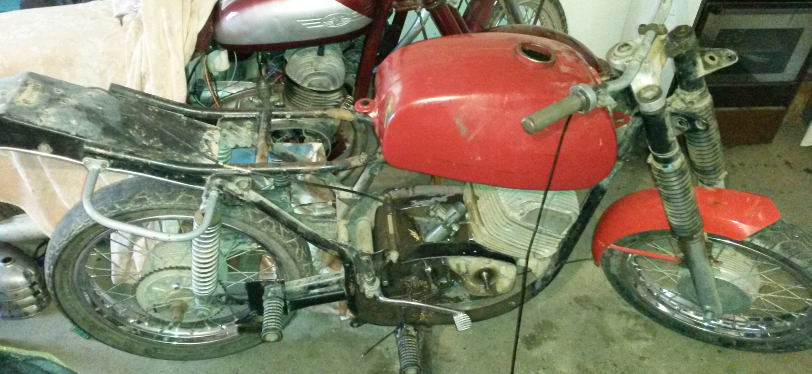 Мотоцикл разобран, но не полностью. Нужно делать кпп. Мотор от 634ки. Зажигание со скутера 12В. Шоссейная резина. Хром на дисках идеал. Переднее крыло укорочено. Есть дуги и дополнительные запчасти: звезда задняя, фильтр, фара, флажки, пульт.