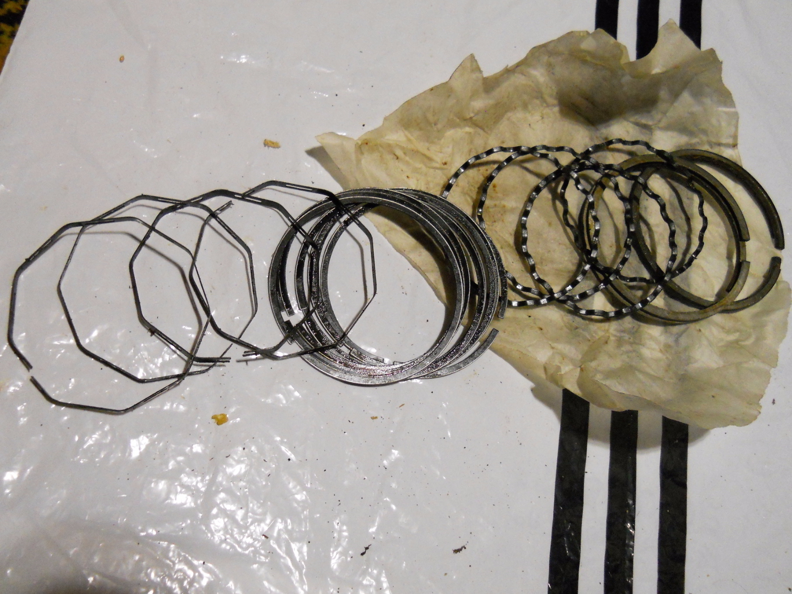 В дополнение к своему предыдущему вопросу прошу опознать деталь на ещё одном прилагаемом фото и тип поршневых колец на другом фото - уж очень они странные: среди обычных имеются также и волнистые, и даже 9-угольные - и все они были упакованы единым комплектом. Может, это какие-то настроечные?..
