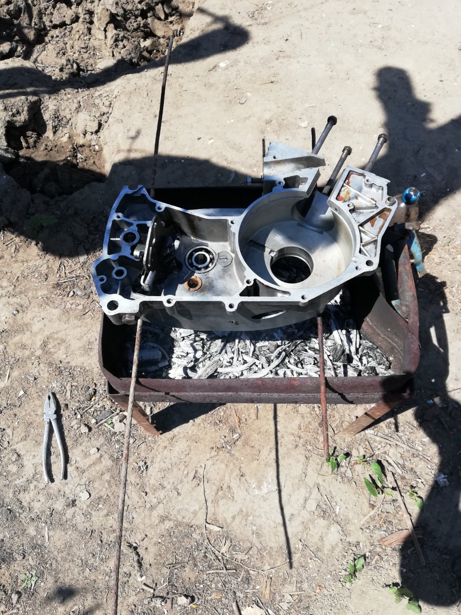 Ни феном, ни электроплиткой прогреть картер мне не удалось. На углях от парочки реек все получилось как положено - слюна шипит.