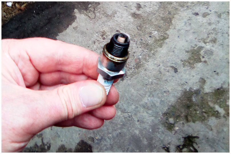 Выкрутил свечки после поездки посмотреть на цвет и был поставлен в тупик. Какой-то сложный цвет получается, окантовка черная, а сам электрод какой-то беловатый. Как это трактовать?
