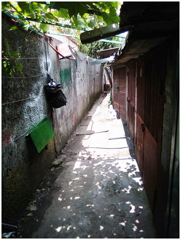 Вид налево. Левая половина ряда по уровню земли немного выше нас, при этом там походу все забетонировано сплошняком до забора, потому вся их вода в дождь течет к нам.