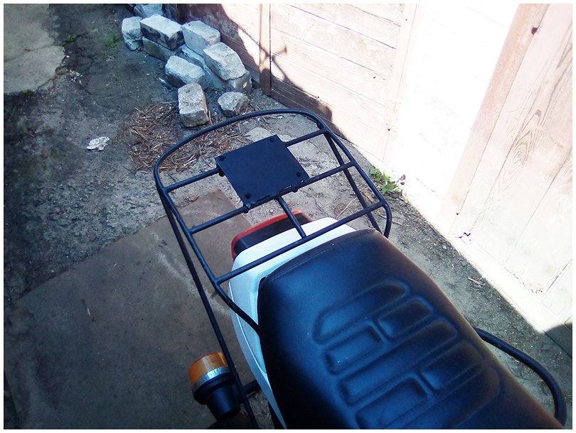 Благодаря неравнодушным людям нашего гаражного кооператива, оборудованным сварочным аппаратом и прямыми руками, у меня теперь есть крепежная площадка для кофра :) Под дырочками подварены "высокие" гайки, теперь болты можно было заворачивать одним ключом, а не двумя, как со штатными рейками. Просто кофр не предполагается к постоянному ношению и будет периодически сниматься и ставиться, так что хотелось упростить процесс.