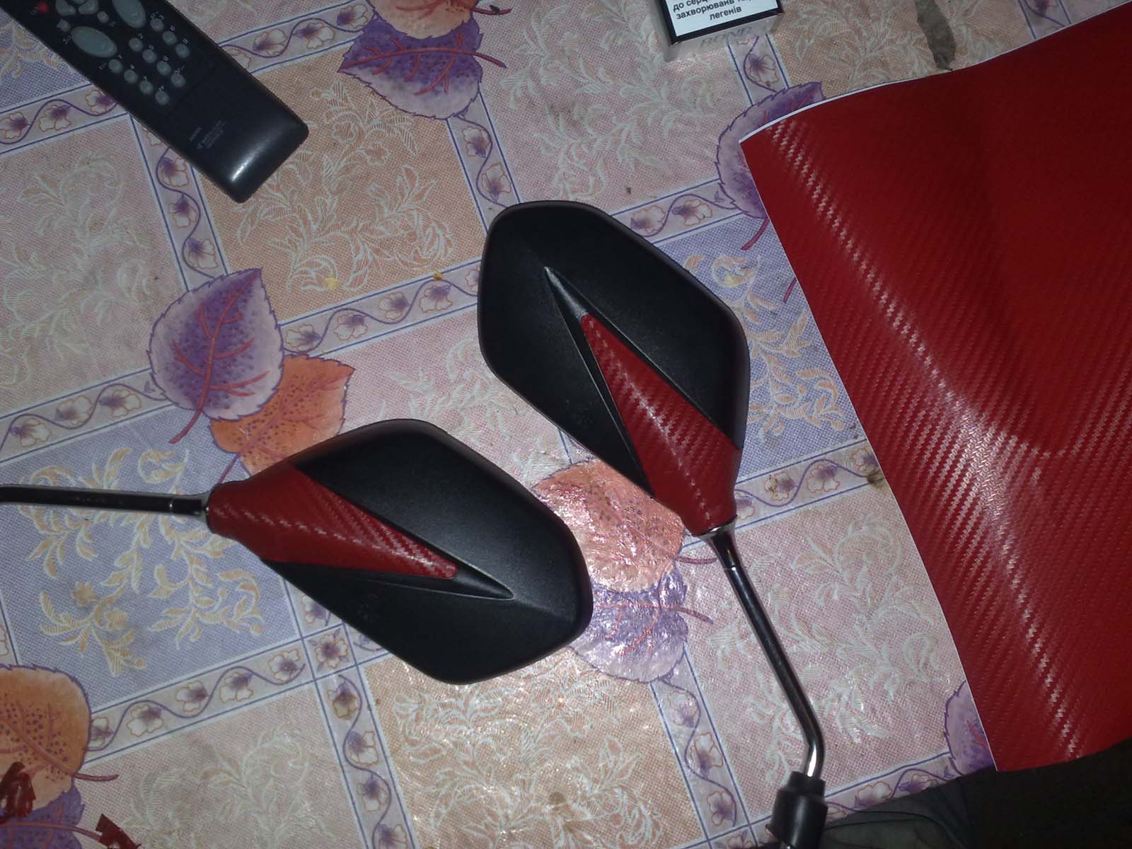Ось я собі поклеїв дзеркала червоним карбонвінілом !(Ява у мене червона) Клеїться дуже легко за допомогою фена! Завтра має прийти ще чорний в суботу-неділю обклею стакани та накладки на бак і викладу фото !
