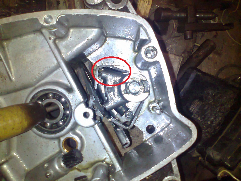 походу нашол причину, согнута кулиса ,на фото видно , розколол двиг и при переключении на разобраном заметил, что ножкой переключает скорость слишком далеко через 2 черезраз то на нетрилку то перед нетралкой фиксатор на угол становится от того и выбивало