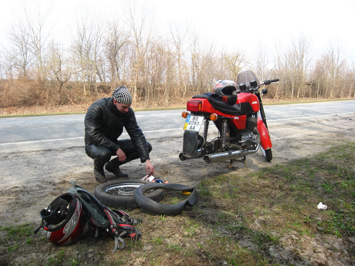 ХРИСТОС ВОСКРЕС!Ну шо ж,при святі вирішив кинути кілька свіжих фоток!Сезон в мене в розгарі,вже встиг накатати 800 км,поломок серйозних не було,ява мене не підводила!Було змінено:задню шину на Dunlop 110.90.18 після того як повилізали нитки всередині старої,під час невеликої подорожі(230 км),заодно поставив нові підшипники в задньому колесі!Також поміняв півавтомат,бо старий захотів на пенсію!І викинув гофри вилки,після того як після пробігу 500 км вони порвались!Поставив 2 сальника в вилку і катаю без гофр,бо міняти їх кожних 500 км якось не хочеться...В гаражі на мене чекають задні аморти від Чезет,і куски заліза,які мають перетворитись в багажник