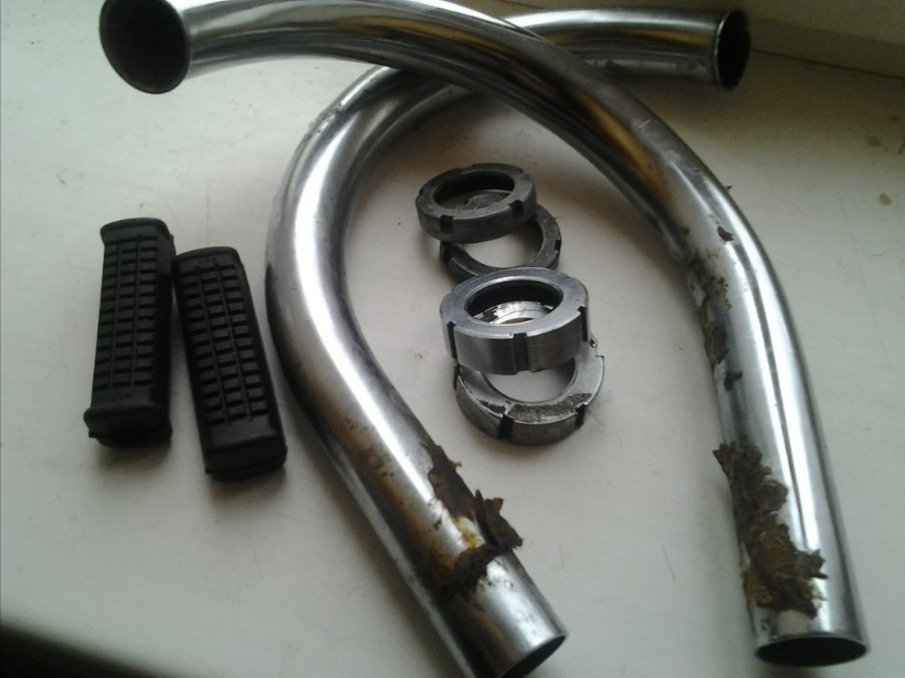 Сегодня мне привезли новые запы на восход :D патрубки глушителей,гайки на цилиндры и трубы.резинки задних подножек.Все новье заводское,старых запасов.Колени в засохшем салидоле и ЗиДовской бумаге,все нужно отмывать и ставить на мот.и наконец
