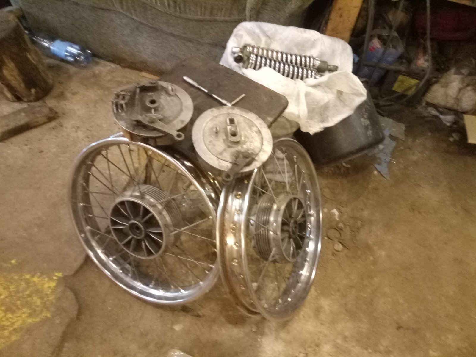 ), ручки на кермо (китай), оригінальні вижимні (зчеплення, тормоз) важилі яви, купу релє, випрямовувачів, штук 6 поворотів з яви (і оригінал і китай є), якісь дзеркала, шпиць штук 30, але якісь тонкі, а свме головне (тадаааааам) - два колеса з тормозними барабанами з яви і передню вісь!