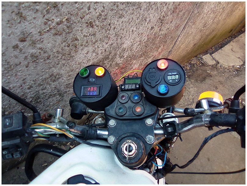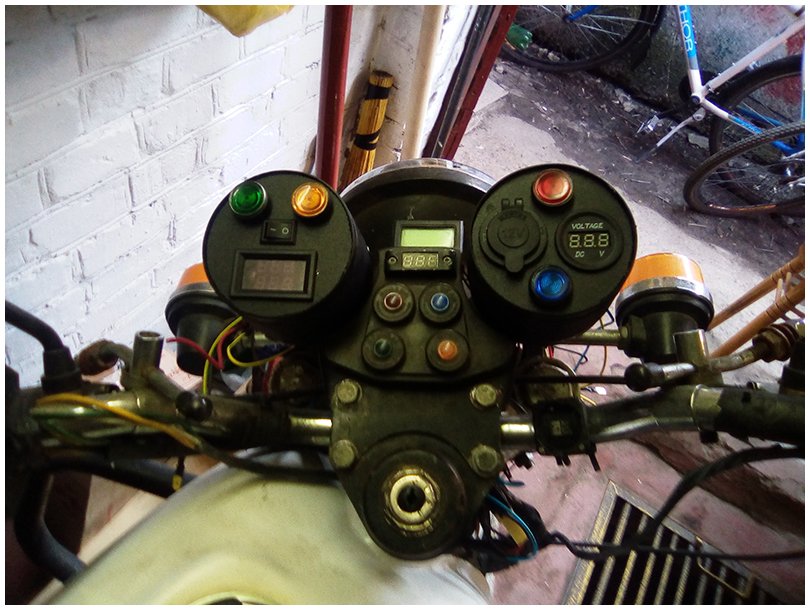 Из штатных приборов ничего не торчит, кроме одного полого болта по центру. Тахометр хоть и китайский, но нифига не электронный, и крепится точно так же, как и оригинальный.