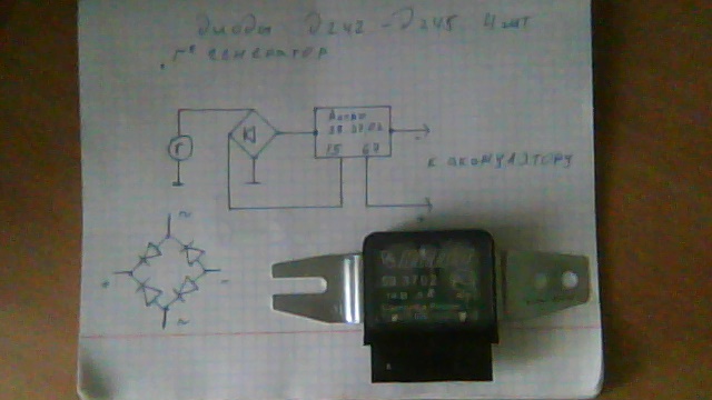 Хорошо что именно тебя интерисует ? Сейчас нарисую схему и выложу по реле оно электронное там всего две клемы не перепутаеш диоды большие желательно совецкие д242-д245 на нагрузку 5 и более ампер повторюсь желательно чтобы основная фара работала только с геном при включённом двиге жди схему пара минут + загрузка