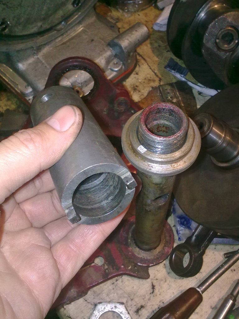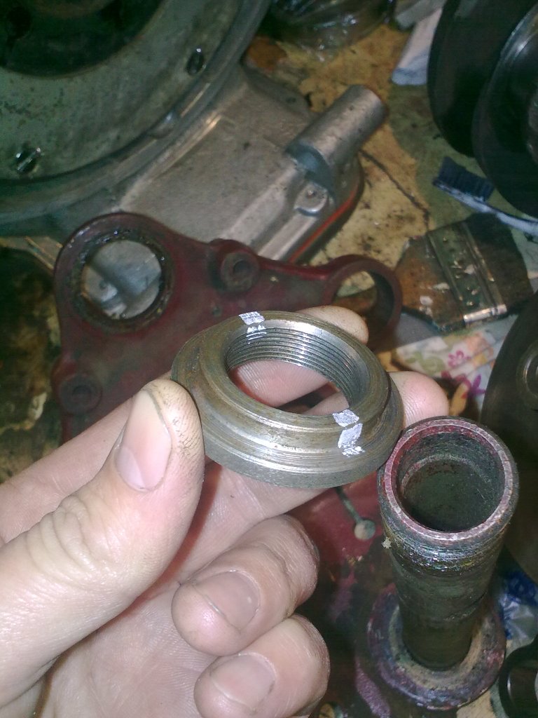 Гайки, що 634, що 638 однакові. Відрізняються з 360тої,там здається труба меншого діаметра, може й ні точно не скажу. Самої гайки немає, але є виточена заготовка, залишилося прорізати шліц під ключ:, сам ключ:, на гайку встановлюється верхня траверса і зажимається другою гайкою, під гайку підклашають стопорну шайбу (шайба на фото відсутня, полінився шукати), приблизно таке коли збереш:. Деталі залишились після заміни вишнівської вилки на вилку від 638мої, гайки перекочували на нову вилку без ніяких змін. В процесі роботи: