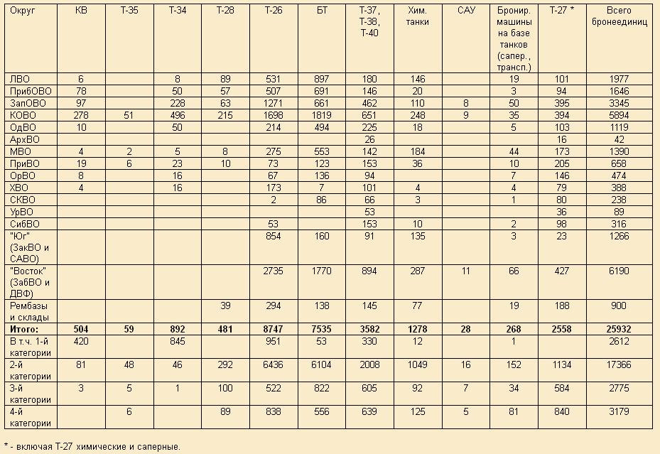 По западным округам считать мне в полдвенадцатого лень, но как минимум видно, что основные танки РРКА - это тоже не КВ, а Т-26 (тот самый "виккерс 6 тонн") и БТ всем семейством.