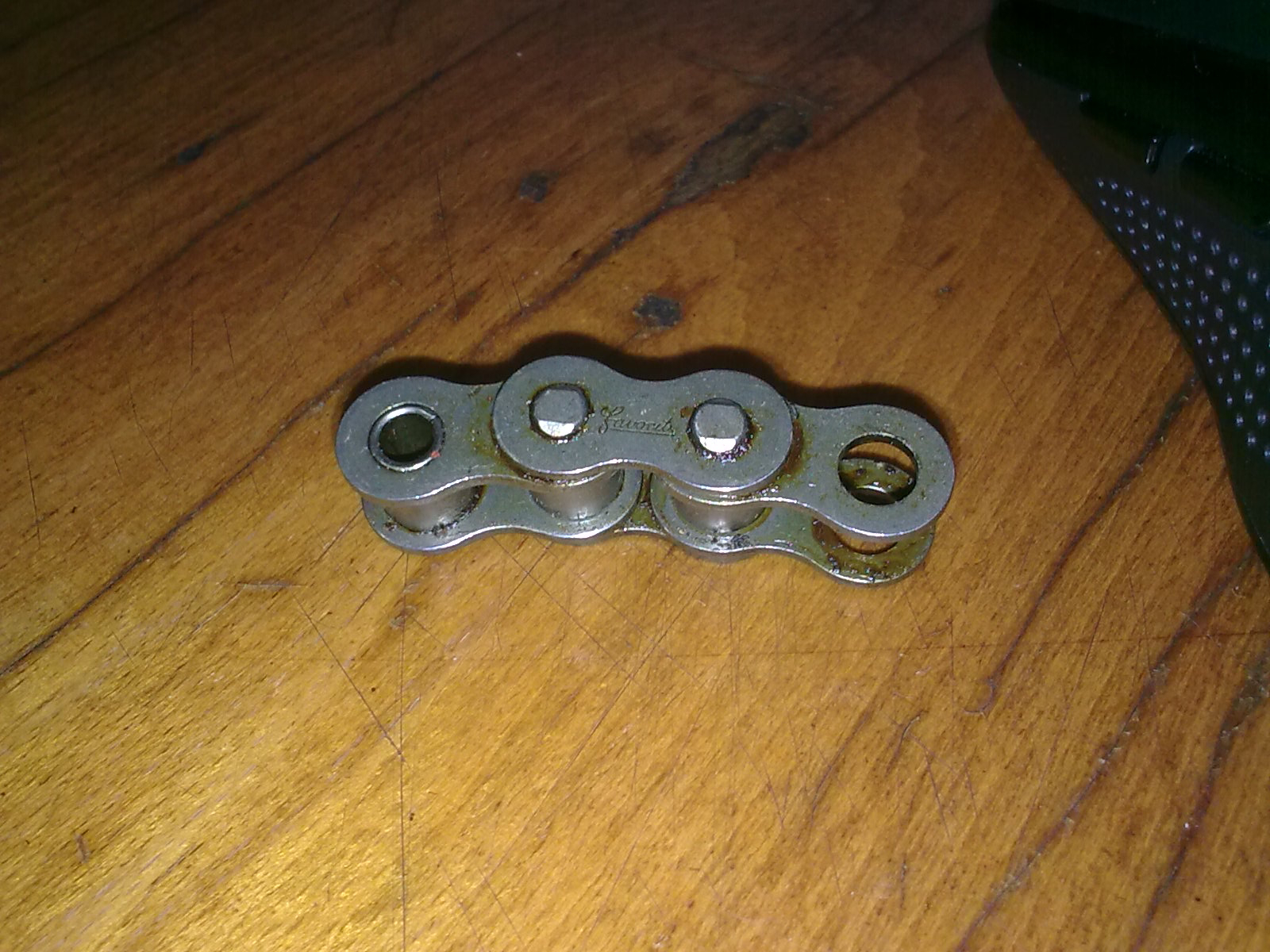 На справжньому фавориті написано саме "фаворит", красивим прописом, такий логотип, як на коробці, ніякого ЧЗ там нема, то китайська підробка. І клепка пальців не керно по центру, а торець пальця розплесканий з двох сторін. Та й не синій він. Ось шматочок залишився від того ланцюга, що встановлений на моїй яві, вкорочував бо був довгий. Доречі, з'єднувальну ланку не рекомендую встановлювати на ній завжди рветься, відміряй потрібну довжину та заклепай.