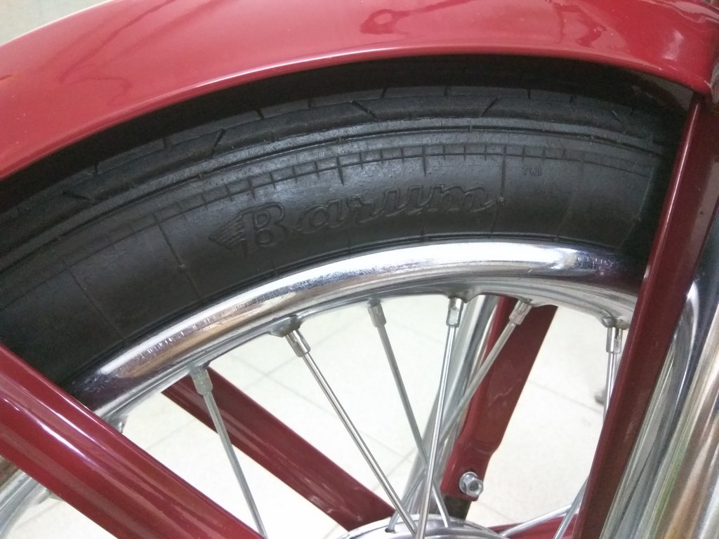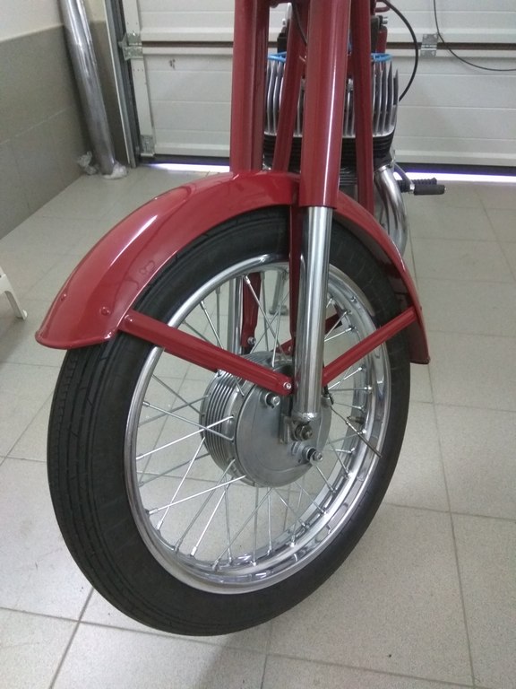 по ходу сборки столкнулся с первой проблемой: передняя покрышка Metzeler ME77 3.50 не влазит по ширине. ее боковины уперлись в стойки грязевого щитка. пришлось достать старую покрышку Barum 3.25 и поставить ее.
