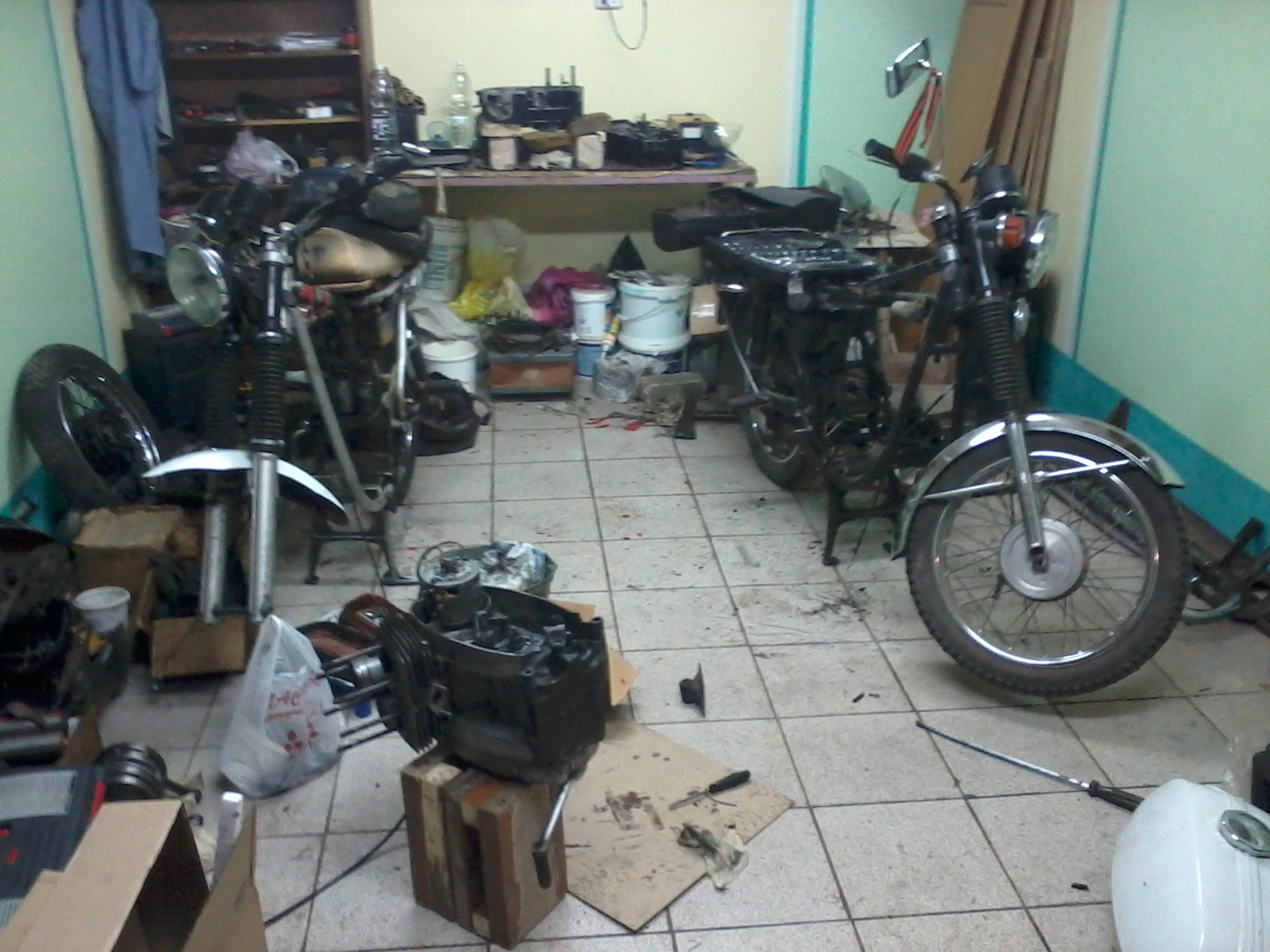 Взяли ещё этот белый, потому что несколько причин ) 1 - новые глушители, 2 -вилка в сборе новая, 3 - резина более менее. В данный момент оба мотоцикла раскиданы по всему гаражу. Решили собрать два, потому что у товарищей нашлись так необходимые детали для восстановления чёрной явы (может и перекрасим в родной красно-морковный цвет). Ну а вообще готовлю белый к чемпионату SNOWDOGS. К счастью проходит он у меня в городе))) Сегодня собрали двигатель на белую (чизовский кстати), завтра залью масло и вперед кататься по гаражу) проверять всё) потом буду всё до ума доводить, для участия в соревнованиях. Всем спасибо за внимание!