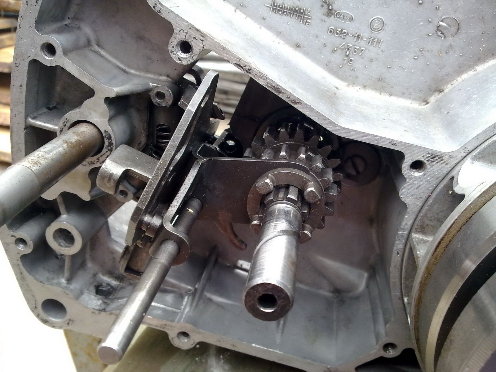 Прежде всего, что требовалось заменить в двигателе: коленчатый вал, моторную цепь, сальники, коренные подшипники коленвала и коробки передач. Сама коробка работала исправно, поэтому разобрав двигатель, я нарочно ее не трогал от греха подальше. Единственное посмотрел на вилочки. Износ их был небольшой. В замене они не нуждались. Сцепление тоже было в норме.