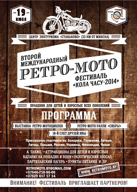 С радостью сообщаем, что в Беларуси 19 июля 2014 года состоится второй Международный Ретро-Мото Фестиваль «Кола Часу 2014» / International Retro-Moto Fest "Wheel of Time 2014" - Праздник для детей и взрослых всех поколений !!! На Фестиваль приглашаем и Зрителей, и Участников на ретро-мотоциклах! .