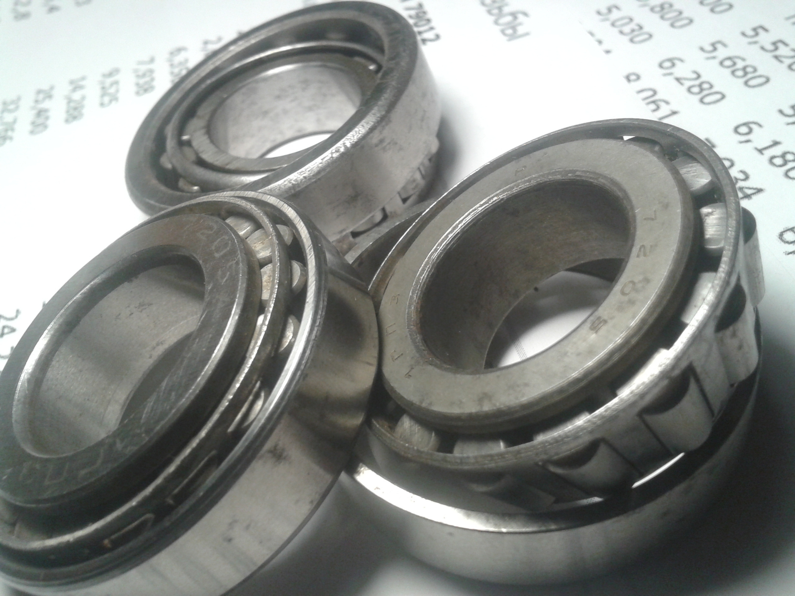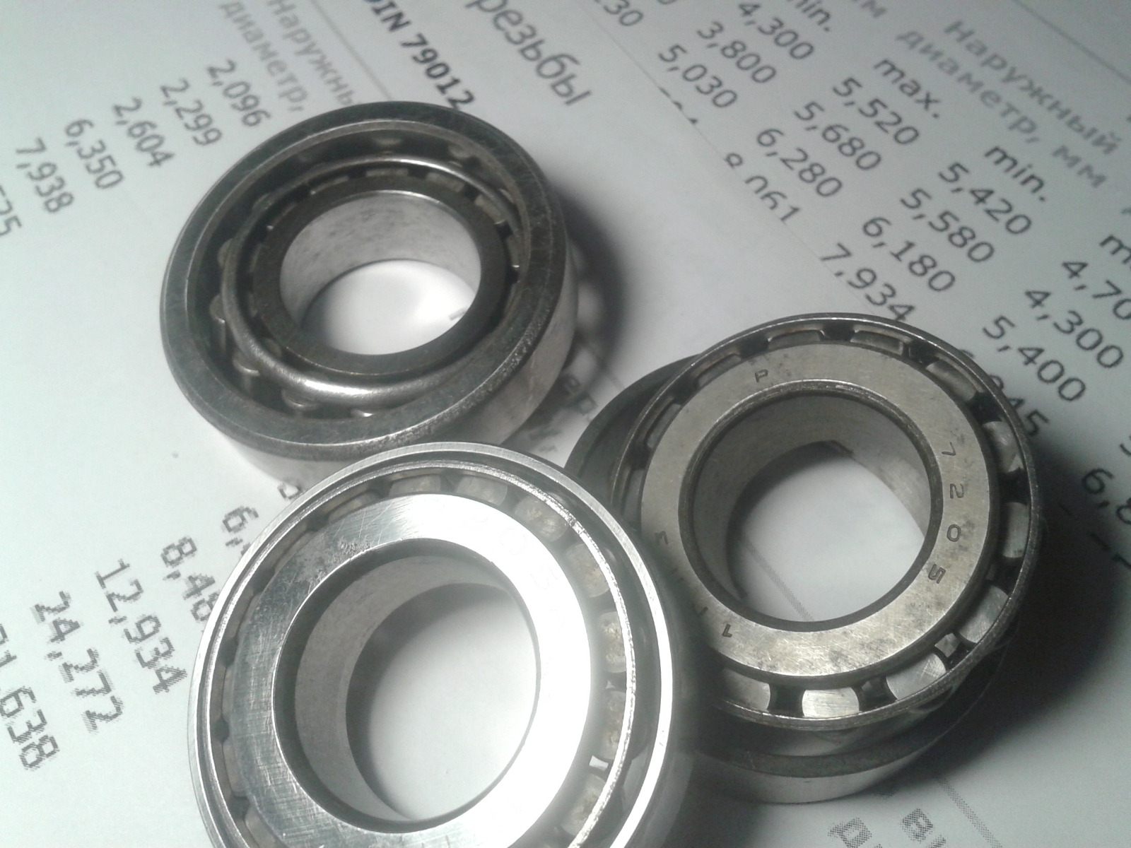 подшипники точно новые и точно совдеповские, (не китай,тайвань, польша или типа чехия) были в глубокой уже засохшей консервации. Отмыл, на поверхности в некоторых местах лишь видны лёгкие пятна окислений - не раковины от ржавчины!!!, а именно оксидное потемнение. То есть подшипники в отличном состоянии. На рабочих поверхностях - роликах и внутренней части конуса наружной обоймы и этих пятен нет.