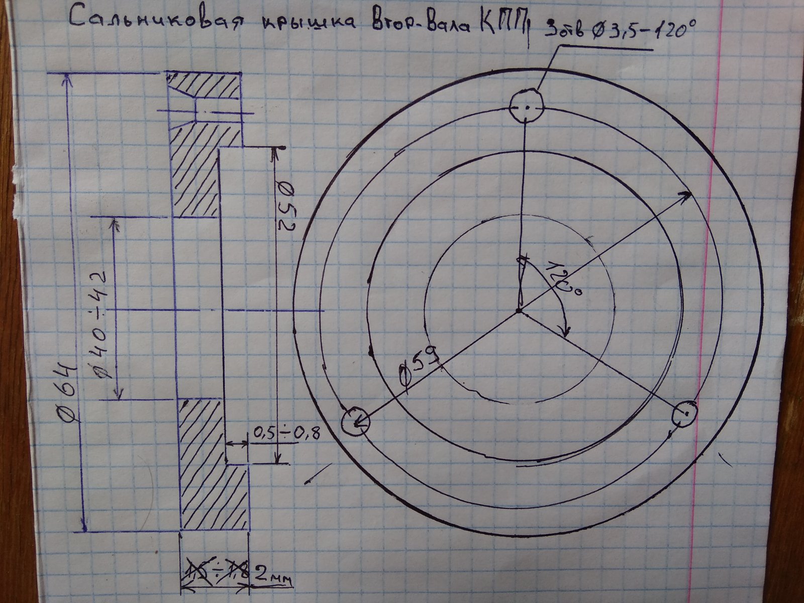 Как я уже говорил, до стопорного там 7мм. Я просверлил сверлом 2,5мм, под резьбу М3, 3 отверстия на глубину 6мм от вершины сверла. Нарезал там резьбу. Выточил саму крышку. Вернее - сперва выточил крышку, просверлил в ней 3 отверстия под 120°, потом приставив к отливу и сальнику, разметил как по кондуктору уже на торце отлива, а потом уже просверлил и нарезал. Сделал подтаи под болтики в крышке.