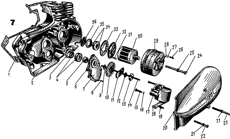 Рис. 7. Механизм выключения сцепления, генератор двигателя мотоциклов моделей А, Б и В: 1 — прокладка; 2 — правая половинка картера; 3 — шайба; 4 — сальник коробки передач с пружинкой; 5 — втулка звездочки задней передачи; 6 — прокладка сальника коробки передач; 7 — корпус сальника коробки передач; 8 — винт; 9 — шайба; 10 — ведущая звездочка задней передачи; 11 — стопорная шайба; 12 — уплотнительная резиновая шайба; 13 — гайка звездочки задней передачи с левой резьбой; 14 — шток выключения сцепления; 15 — винт; 16 — пружинная шайба; 17 —корпус редуктора привода спидометра в сборе; 18 — рычаг с валиком выключения сцепления; 19 — пружина рычага; 20 — правая крышка картера; 21 — уплотнительное медное кольцо; 22 и 23 — винты; 24 — болт; 25 — пружинная шайба; 26 — винт: 27 — пружинная шайба; 28 — шайба; 29 — статор генератора; 30 — ротор генератора; 31 — винт; 32 — корпус сальника коленчатого вала; 33 — прокладка сальника; 34 — сальник коленчатого вала с пружинкой; 35 — шайба; 36 — шарикоподшипник
