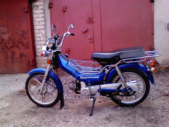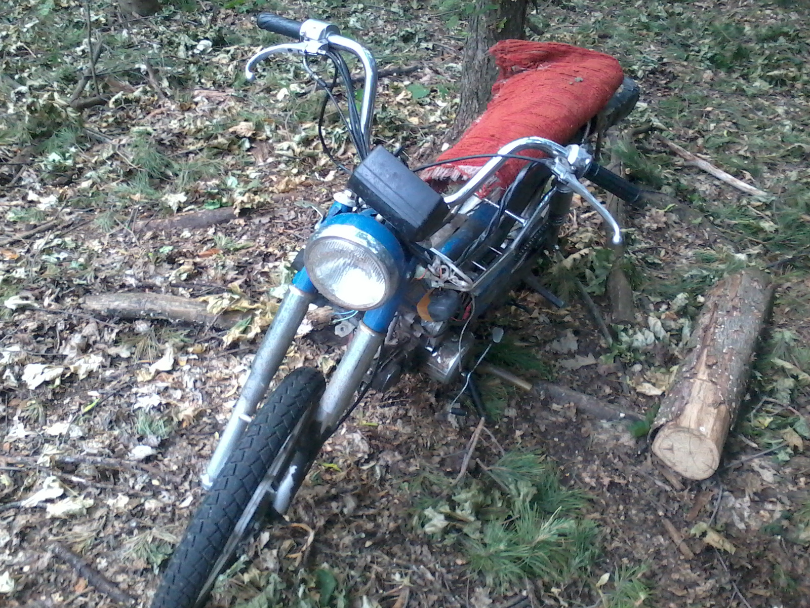 По просьбе трудящихся выкладываю фотку своего "попердуйчика" с правой стороны... Есть над чем поработать, но сзади "урон" больше-стоят поворотники х.з. с чего и... карпатовский "стопак"! Поворотники под замену, стопак поставлю родной благо он есть в "довеске" к мопеду вместе с родным карбом и родной электроникой...
