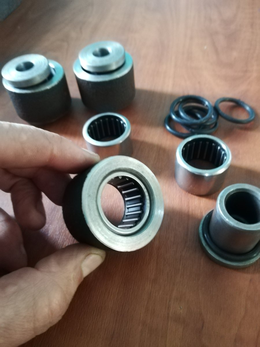 Игольчатый подшипник 22х28х20 с наружней обоймой, запресован в муфту, работать будет по поршневому пальцу ВАЗ 22 мм. В торцы пальцев выточены направляющие втулки, через которые болтом М12 будут стягиваться полосы коромысла.
