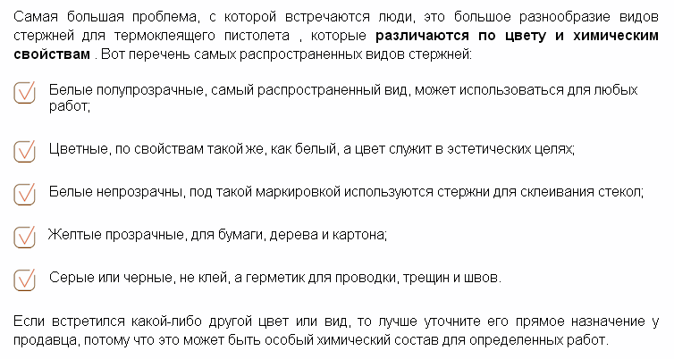 Более понятное описание цветных палочек по цветам для термо-пистолета: