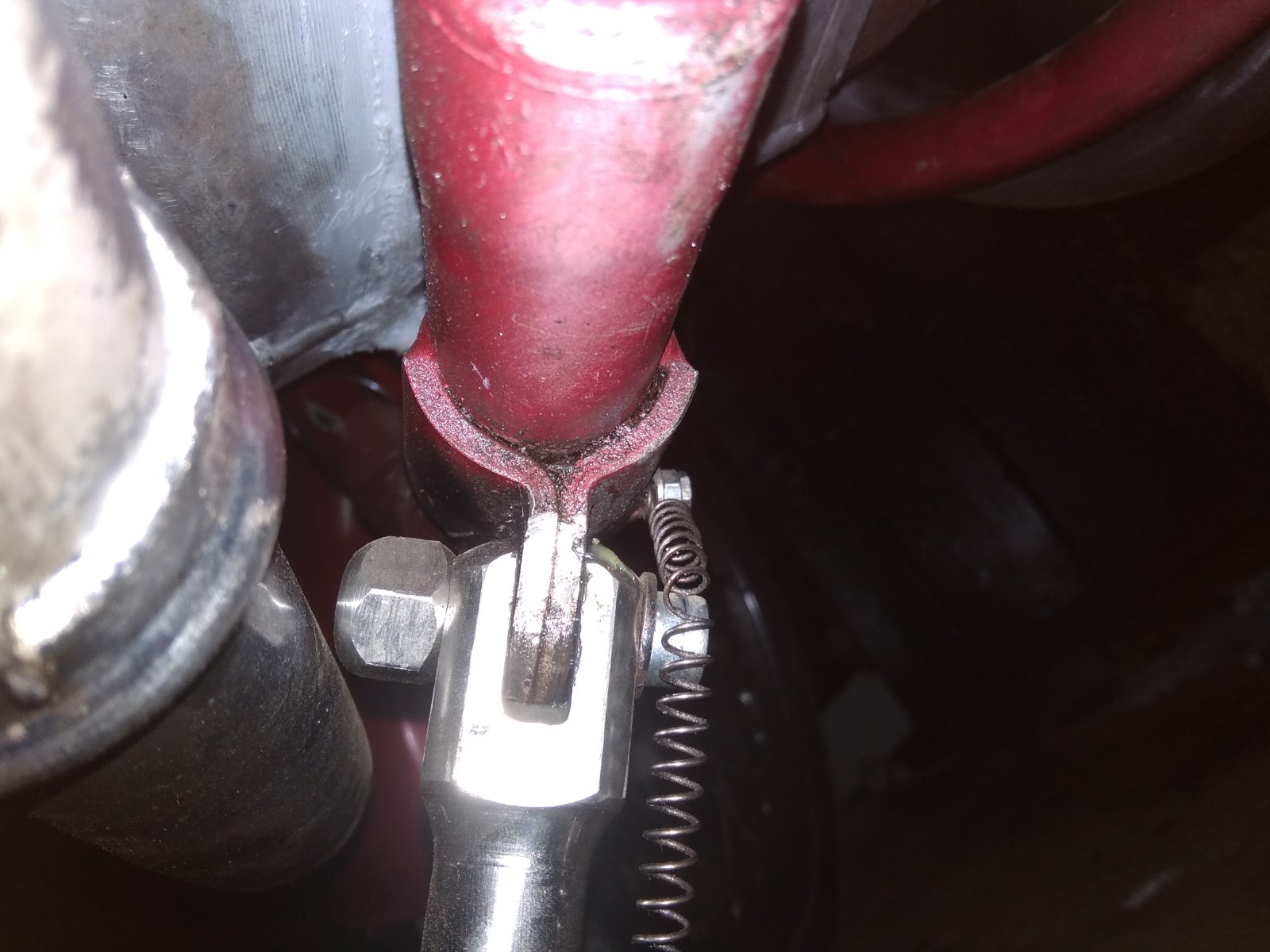 Нет, пружина как раз и натягивает, только с люфтом получается не туда куда надо. И подножка удлиненная. Я уже хотел прикрутить к ней редкоземельный магнит, чтоб к глушаку прилипала