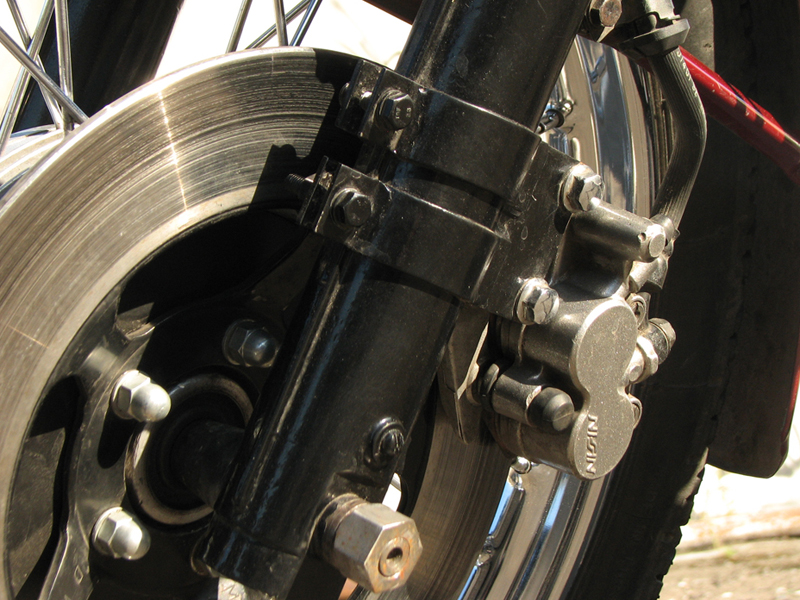 Из переделок - мы долго сомневались, но все таки решились поставить передний дисковый тормоз. Не хотелось портить внешний вид переделками и пришлось много попотеть, чтоб он выглядел максимально гармонично с родной вилкой и колесом. Остальное по мелочам - болтики, гаечки, тросики - стараемся или искать оригинал или точить... кроме этого я все таки сняла обтекатель и багажник, переставила аморты и она стала чуть пониже, мне так удобней, но вдвоем так не поездишь, особенно по львовской брусчатке и рельсам...