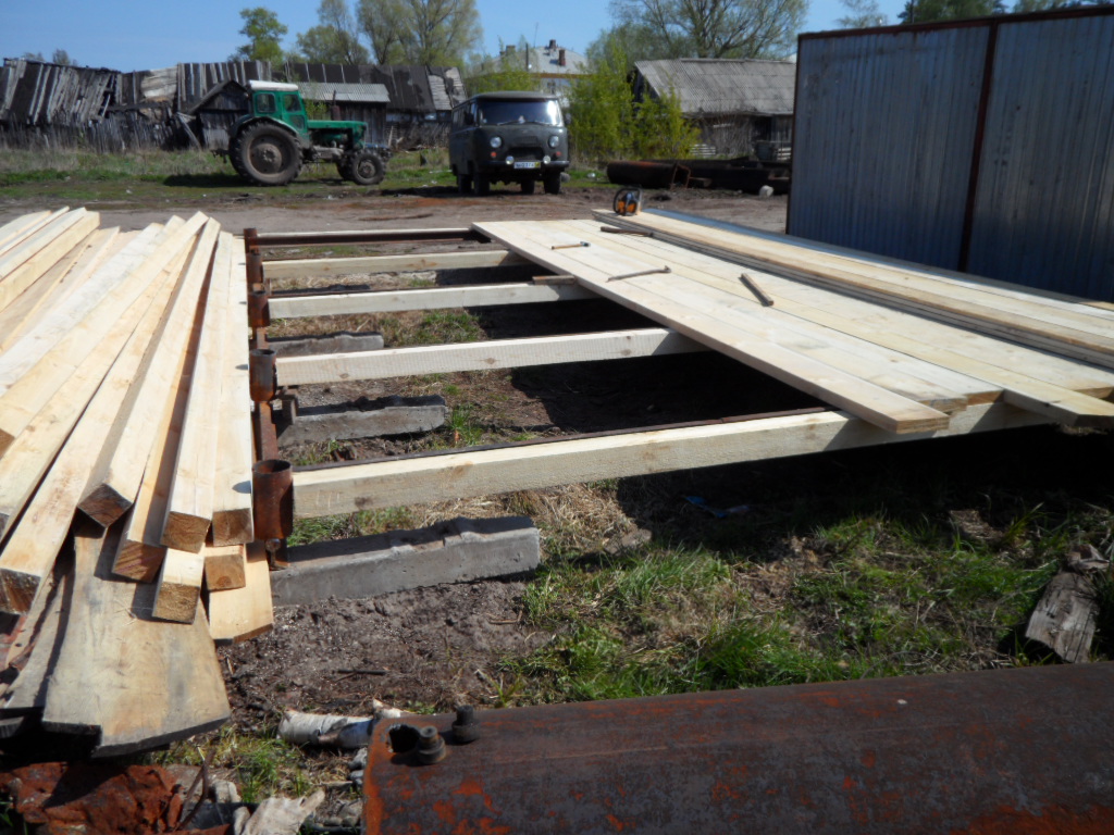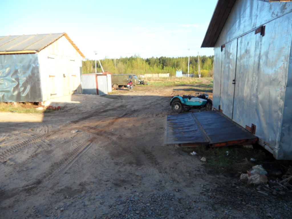 Все началось с того что 3 года назад мы периехали на новую квартиру,доэтого мы жили встаром доме и гараж под технику был в другом месте рядом с тем домом.И вот в этом году решили мы делать новый гараж на новом месте а то в старый ходить далеко 1 км примерно,да и маленький он совсем Ява ,скутер,Восход ,велики вообщем тестно.Новый гараж ставим рядом с домом метров 150 до него.Сначала сварили под него сани из рельсов 4 на 6 ,в наших краях только так и делают.на фундамент не ставят ! болотистая местность.Сани выставляються ,выравниваються, из бруса делаеться каркас потом обшиваеться тесом и железом.