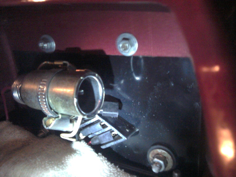 Глушаки завтра сфоткаю , они намного длиннее китайских ..... , выкладываю , по просьбе , фотки прикуривателя . Саи прикуриватель "ВАЗ", крепился с помощъю хомута , с просверленным отверствием и прикрученым к болту крепления стопа . Ветровик делал сам