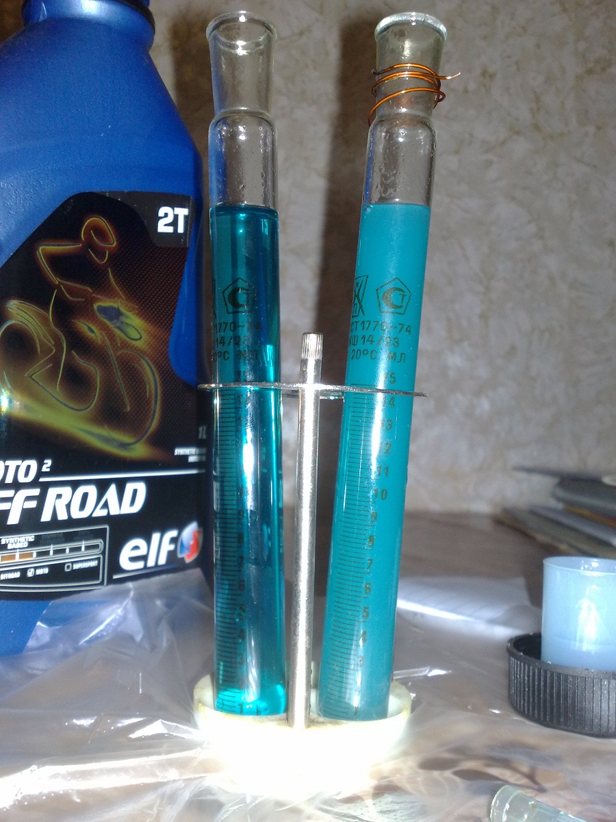 И так, коротко о результатах моего опыта, в бензине со спиртом двухтактное масло растворяется заметно хуже,причем после интенсивного взбалтывания смесь имеет непонятный мутновато-беловатый оттенок , после 15 минут простоя появляется четкое деление фракции на две составляющие, а также наблюдаются в звешенном состоянии капельки непонятной жидкости. Кому интересно могу вечером загрузить фотки.