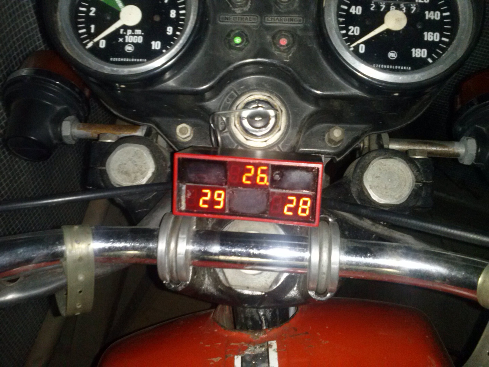 и прочая приятная мелочная работа, в т.ч. установка 2-х термометров на цилиндры (низ слева и справа и термометр-вольтметр-тахометр по центру вверху). Кобобку для индикации смостырил сам, датчики расположил между сужениями ребер охлаждения головок, 3-тий (температура за бортом) расположил под приборкой.