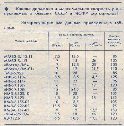 Журнал за 94 год(3-5 номер,в этих пределах). Точный номер скажу в понедельникJUK писав:oleksa , откуда ты взял эту таблицу скоростей ? Год и месяц журнала скажи . Мне просто интересно почему в ней не 638 ява , которых наделали сотни тысяч при совке , а 639 00 , которую как я понял делали небольшими партиями после развала , и у которой уже понижена степень сжатия и дефорсированый двигатель не 26 а 24 л с . А может 639 00 - это вобще какой то галимый чоппер ?