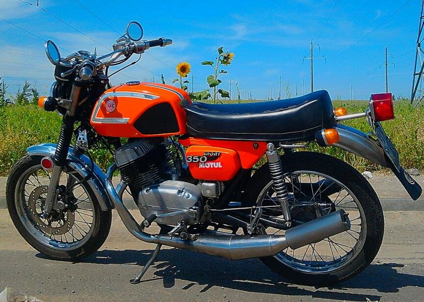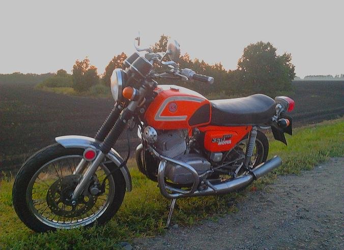Даа, в начале лета я неслабо "приехал" на ЧЕЗЕТ-е - слетела цепь и заклинила в маятнике... Удержав мотоцикл от падения и вовремя выжав сцепление, не дав мотору заглохнуть, остановился, осмотрел и прифигел - цепь вывернулась на 90 градусов и заклинилась между маятником и звездой ведомой, но со звезды на двигателе не слетела. С трудом выковырнув цепь и натянув её на колесо, обнаружил что она провисла в край, хотя перед поездкой была натянута как надо (поездка закончилась примерно при 100 км после выезда по пути обратно). Ослабив преднатяг амортов, занизил зад, обеспечив приемлемый натяг цепи. Запустил мотор, 1-я, 2-я... 50 кмч, еле еле ползём... Отодвигаюсь назад и разгоняюсь на 3-й до 70 - 80 кмч, перехожу на 4-ю и на 80-ти кмч докатываю до гаража и сразу снимаю цепь. На след. день снимаю правую крышку картера и вижу что всё улито маслом из коробки, оказалось что... выскочила из посадочного места правая втулка пром. вала КПП и масло выгнало через образовавшийся зазор. Ясно -двигатель снял на "капиталку", а на его место поставил "запасной", собранный в картере двигателя ЧЗ 472.5. (отличается по заднему креплению от моего 472.3-го), после подгонки верхнего крепления он стал в раму, а вот нижнее крепление так и не удалось сразу закрепить - из за особенностей рамы 472.3-го (она гораздо уже 5-го по низу). Ну ничего, пошла первая тысяча обкатки "нового" мотора (новые ЧССР - овские поршни от Явы - "старушки", пальцы на 15 мм, чехословацкие кольца и "старушкин" коленвал на новых подшипниках). Сразу ощутил что он совершенно другой в работе - более отзывчивый на газ, мягкий в работе и более тихий. Попутно немного развёл глушители сзади - получился вид ближе к "неоклассикам".