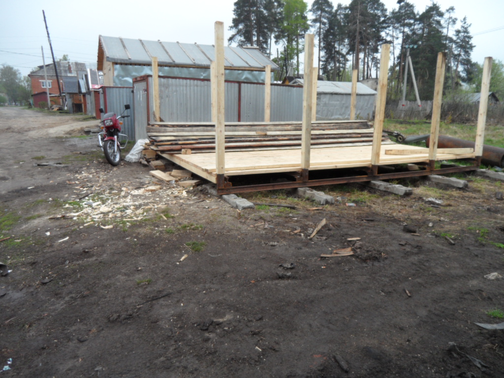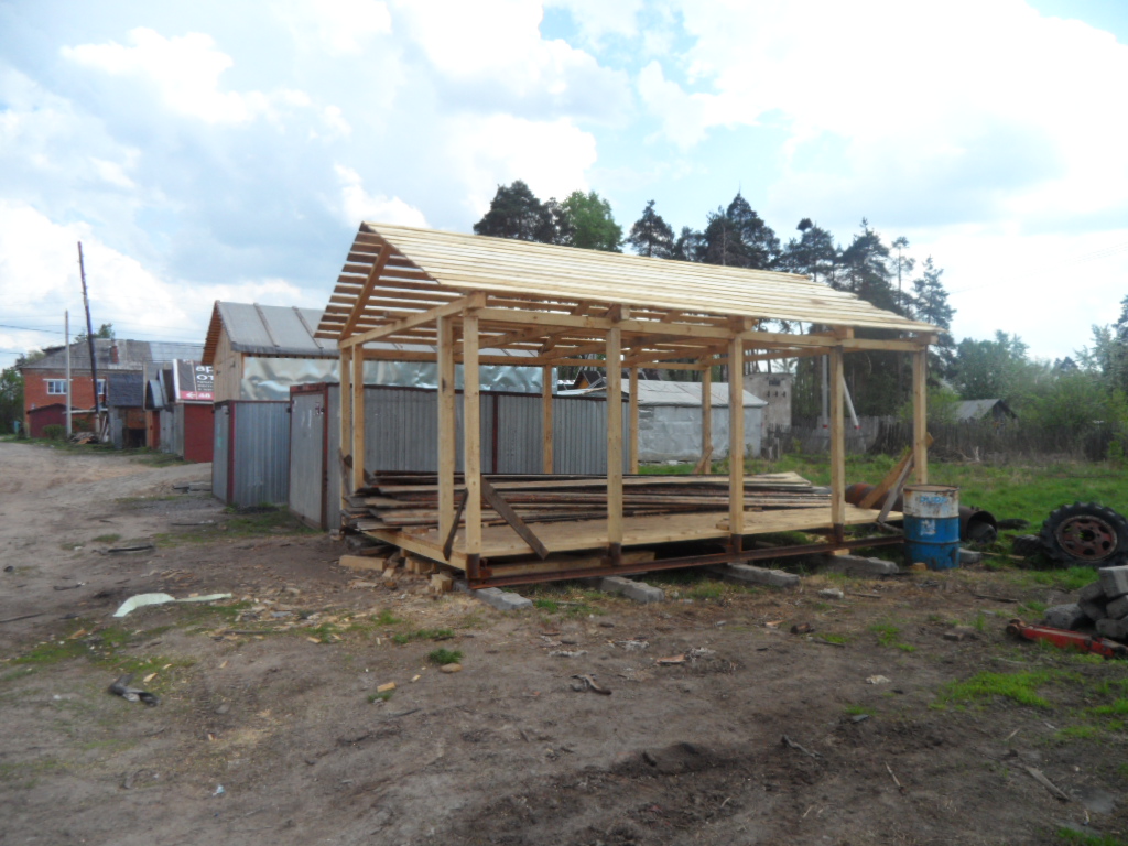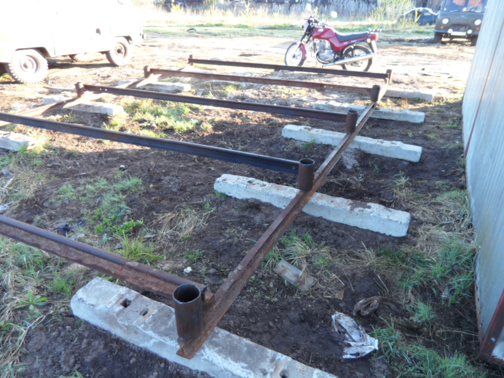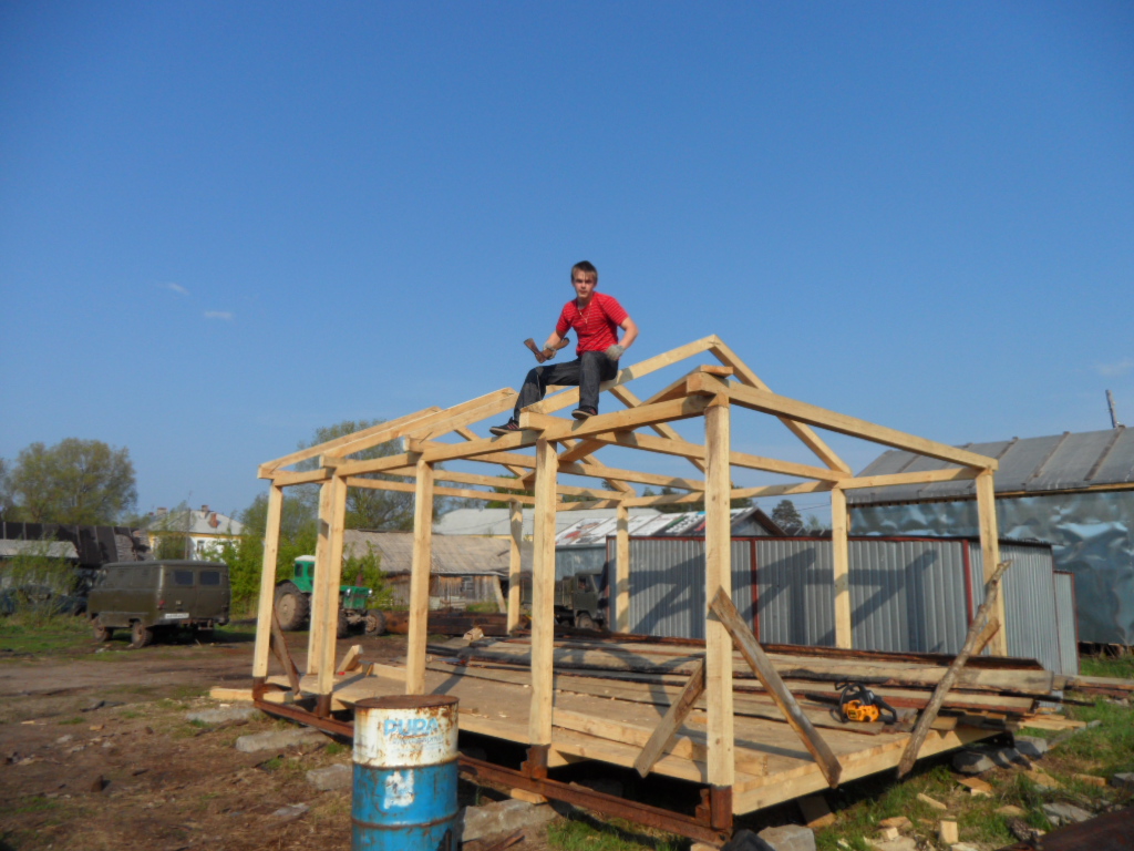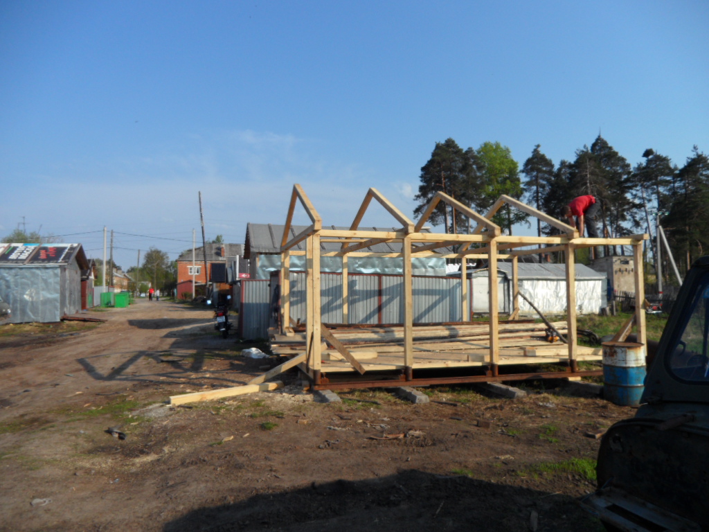 Все началось с того что 3 года назад мы периехали на новую квартиру,доэтого мы жили встаром доме и гараж под технику был в другом месте рядом с тем домом.И вот в этом году решили мы делать новый гараж на новом месте а то в старый ходить далеко 1 км примерно,да и маленький он совсем Ява ,скутер,Восход ,велики вообщем тестно.Новый гараж ставим рядом с домом метров 150 до него.Сначала сварили под него сани из рельсов 4 на 6 ,в наших краях только так и делают.на фундамент не ставят ! болотистая местность.Сани выставляються ,выравниваються, из бруса делаеться каркас потом обшиваеться тесом и железом.