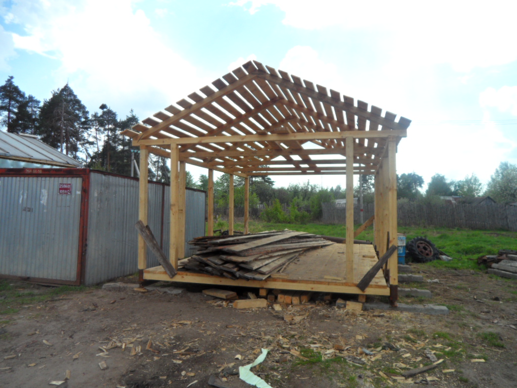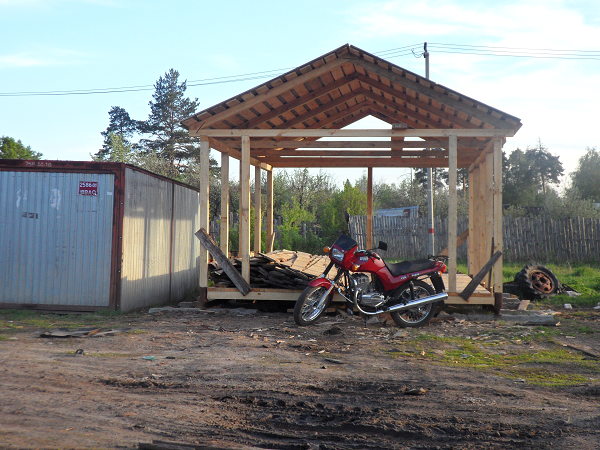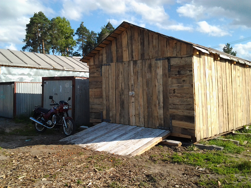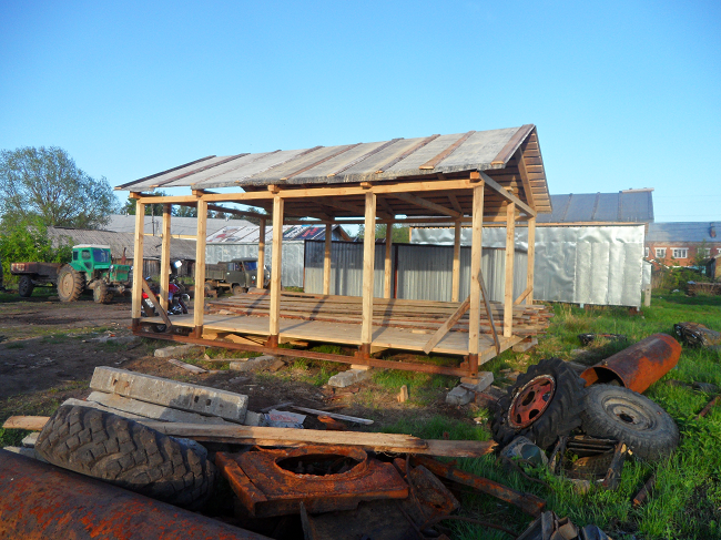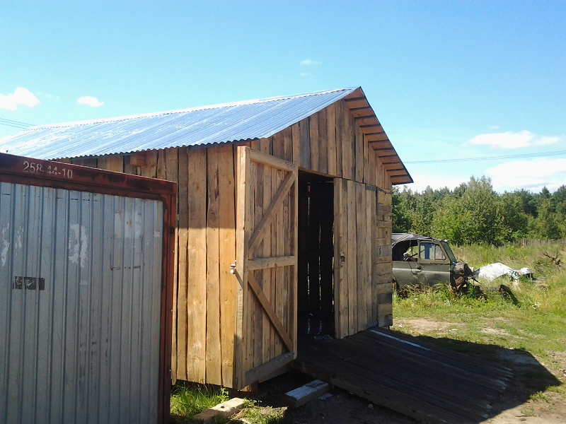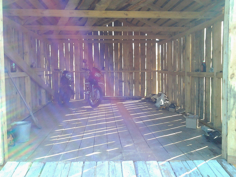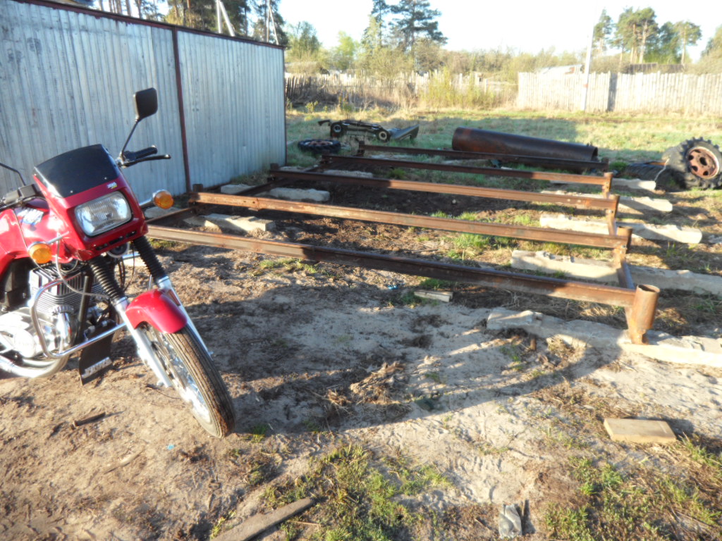 Все началось с того что 3 года назад мы периехали на новую квартиру,доэтого мы жили встаром доме и гараж под технику был в другом месте рядом с тем домом.И вот в этом году решили мы делать новый гараж на новом месте а то в старый ходить далеко 1 км примерно,да и маленький он совсем Ява ,скутер,Восход ,велики вообщем тестно.Новый гараж ставим рядом с домом метров 150 до него.Сначала сварили под него сани из рельсов 4 на 6 ,в наших краях только так и делают.на фундамент не ставят ! болотистая местность.Сани выставляються ,выравниваються, из бруса делаеться каркас потом обшиваеться тесом и железом.