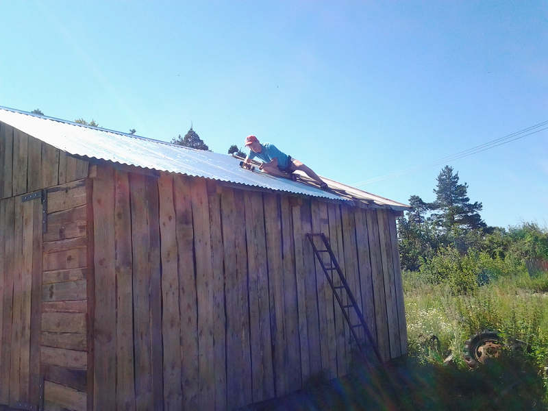 Покрыли крышу временно рубиройдом,потом думаем покрыть железом! Теперь осталось усилить стены еще брусом между собой связать и потихоньку обшивать тесом. Ну теперь главное крыша есть, дальше работа будет полегче да и дождик немешает.