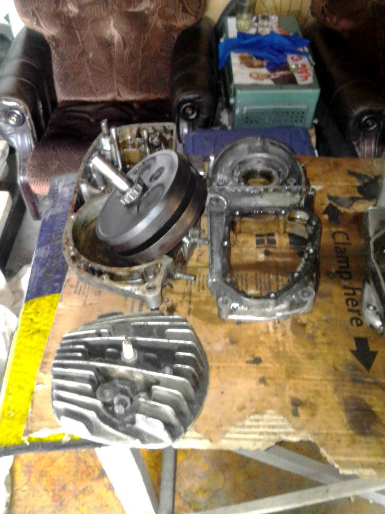 циліндр,головка циліндра була пофарбована серебрянкою поверх болота, піскоструй брати не хотів, тому це все діло наждачками(Головку геть на роботу брав :) ), шпателями, ножиками чистив, шліфував, а в кінці все відпіскоструїв, не забувши і про картер)