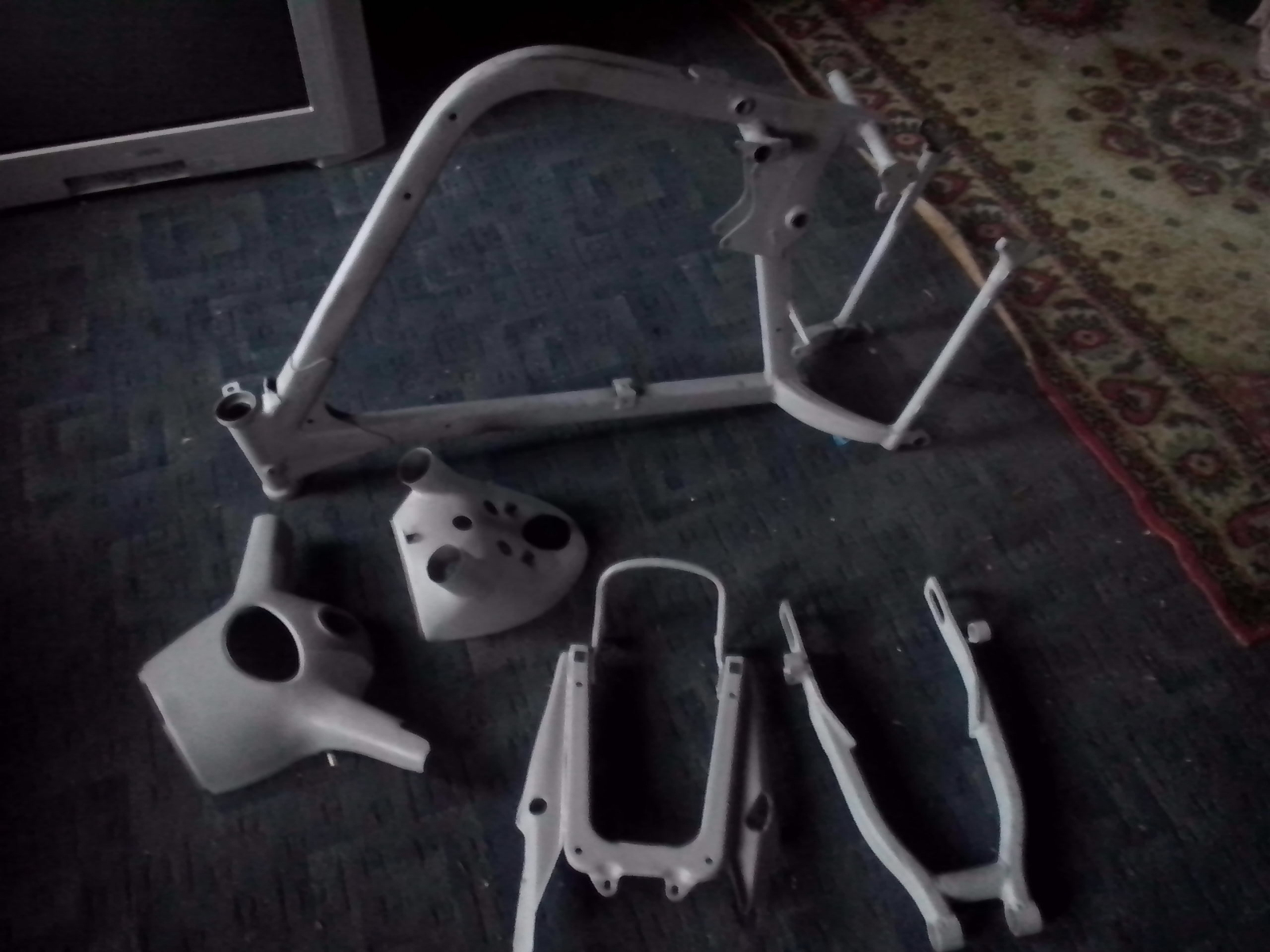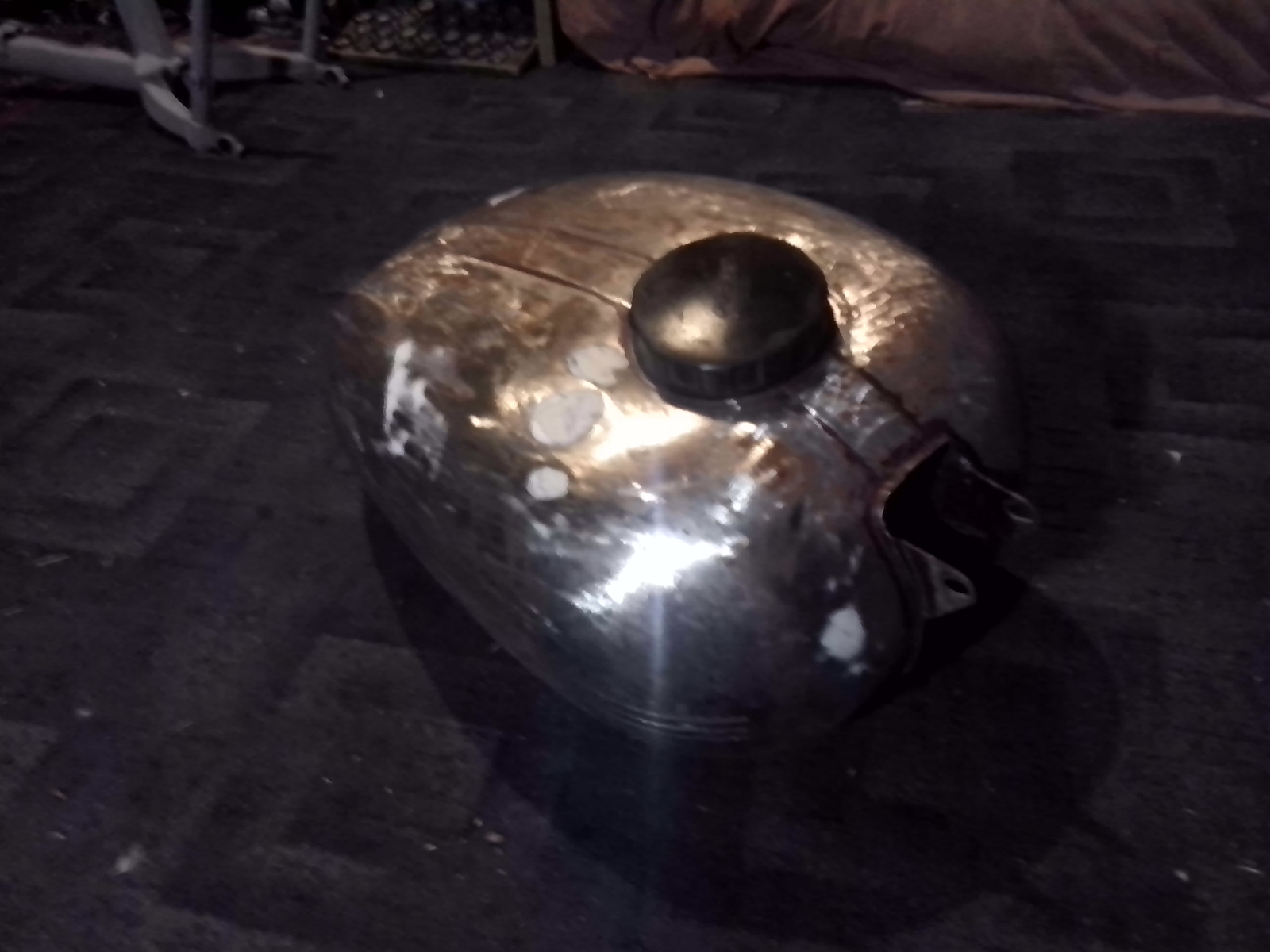 Немного потрудился, многое зачистил и по грунтовал, но ещё далеко не всё. Дошло дело до бака. Он цельно хромирован, естественно в убогом состоянии. Начал его полировать, до полировался до меди)))) Теперь стал вопрос как его покрасить? Как думаете, задуть в один цвет и навести цировки или хром заменить белым цветом и цировки белые по всему моту? Или какие ещё есть варианты на Ваше усмотрение? Фото старое, но суть проблемы видна.