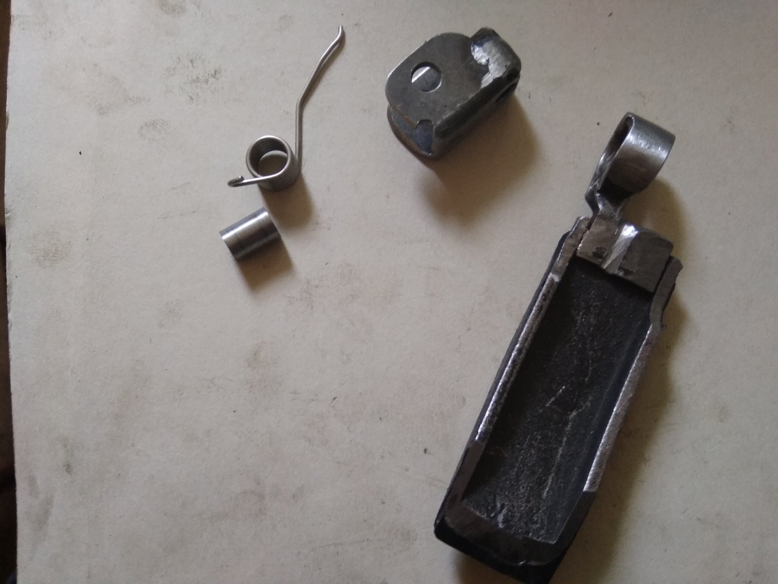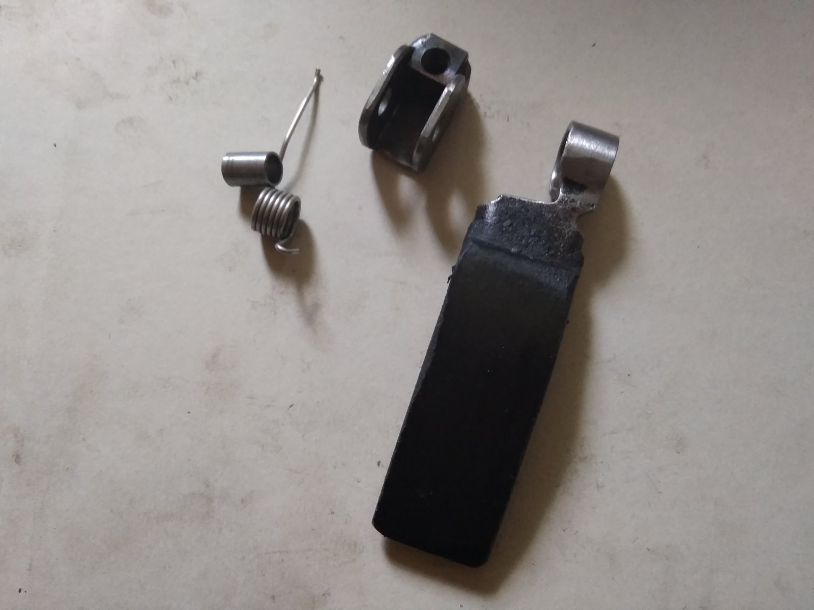 Ухо широким не делал, что бы смещение было достаточным. Возможно и ухо делать широким, и смещение обеспечить, но тогда нужно мудрить смещение за счёт этой скобы, делать её хитро-мудро навороченной. Я выбрал вариант более простой, тем более, что для нагрузки в этом узле , на сам узел, при его работе практически минимальны. При продумывании я рассматривал разные варианты размеров и скобы, и уха, и способа крепления, и встраивания пружинки. Самым оптимальным, после замеров и подгонок оказался этот. Сечение в самом тонком месте у башмака и уха 6Х6 - более чем достаточно по жёсткости. Как то так. Главное идея и принцип, а вы уж подгоняйте по своему - делайте толще, меряйте, снимайте лишнее, что бы впритирку туда не тулить. В итоге будет где то так.