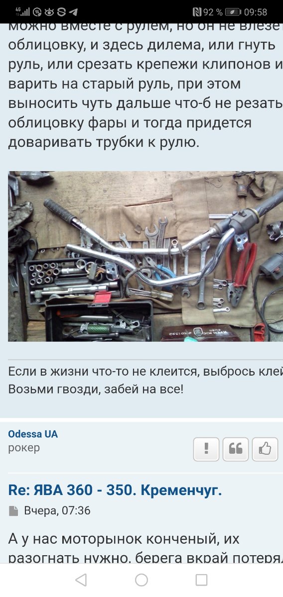 Aleks1978 писав: 22 червня 2020, 06:49 якщо руль старуховський залишиш то різати або гнути нічого буде не треба. судячі з фото ,кріплення вижимних у тебе в задовільному стані,тож міняти їх не треба. просто курки з 634 туди вставити ,товариш мій так і зробив. а там вже дивись як тобі кращє. ну а подовжити руль за рахунок вставлення підходящіх трубок,то вже задоволення а не робота.