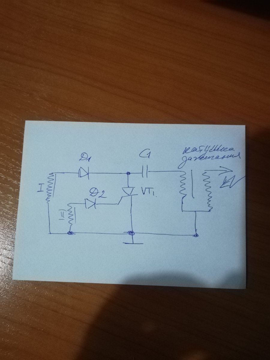 В момент, когда активный элемент шторки-модулятора проходит рядом с катушкой 2 (индуктивный датчик) в нем тоже вырабатывается переменный ток, который выпрямляется через диод Д2 и открывает силовой тиристор.