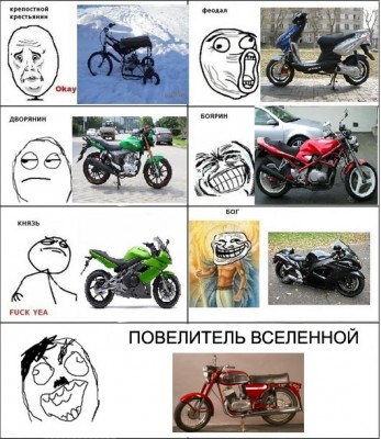 - Мотоцикл: Минск => ИЖ Ю4 => Jawa 634 = > Java 638 => Jawa 638 Люкс => Kawasaki KLR 650 c => Yamaha WR250X\R