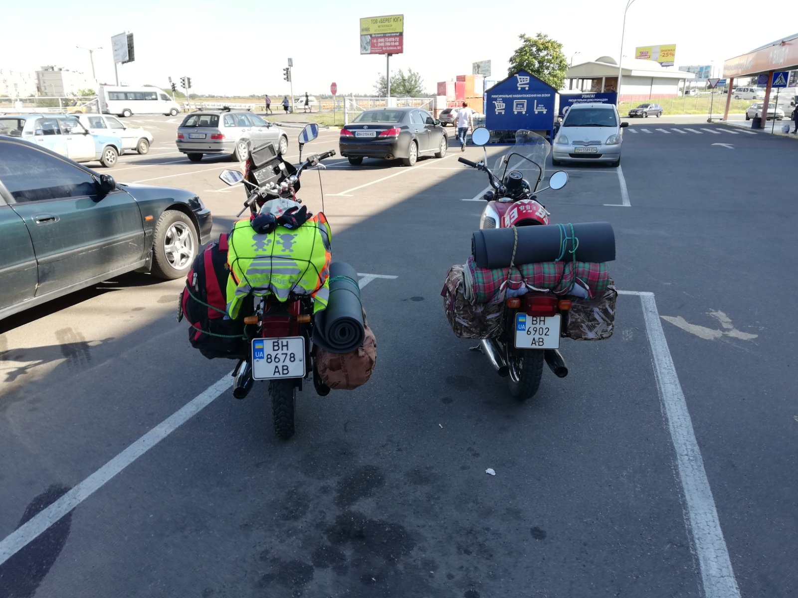 Продукты питания с собой никогда не вожу, питание в основном в придорожных заведениях. Если паркуюсь с палаткой в кемпинге, то скидываю с мотоцикла все вещи и еду специально за продуктами в ближайший супермаркет или продуктовый рынок. Чай, сахар, булочки или пряники, помидоры, огурцы, хлеб, яйца, сало, консерва. В дороге с собой во всех карманах шоколадки, бывало такое, что за день 500-600 км и шоколадка дает фору на час-второй.