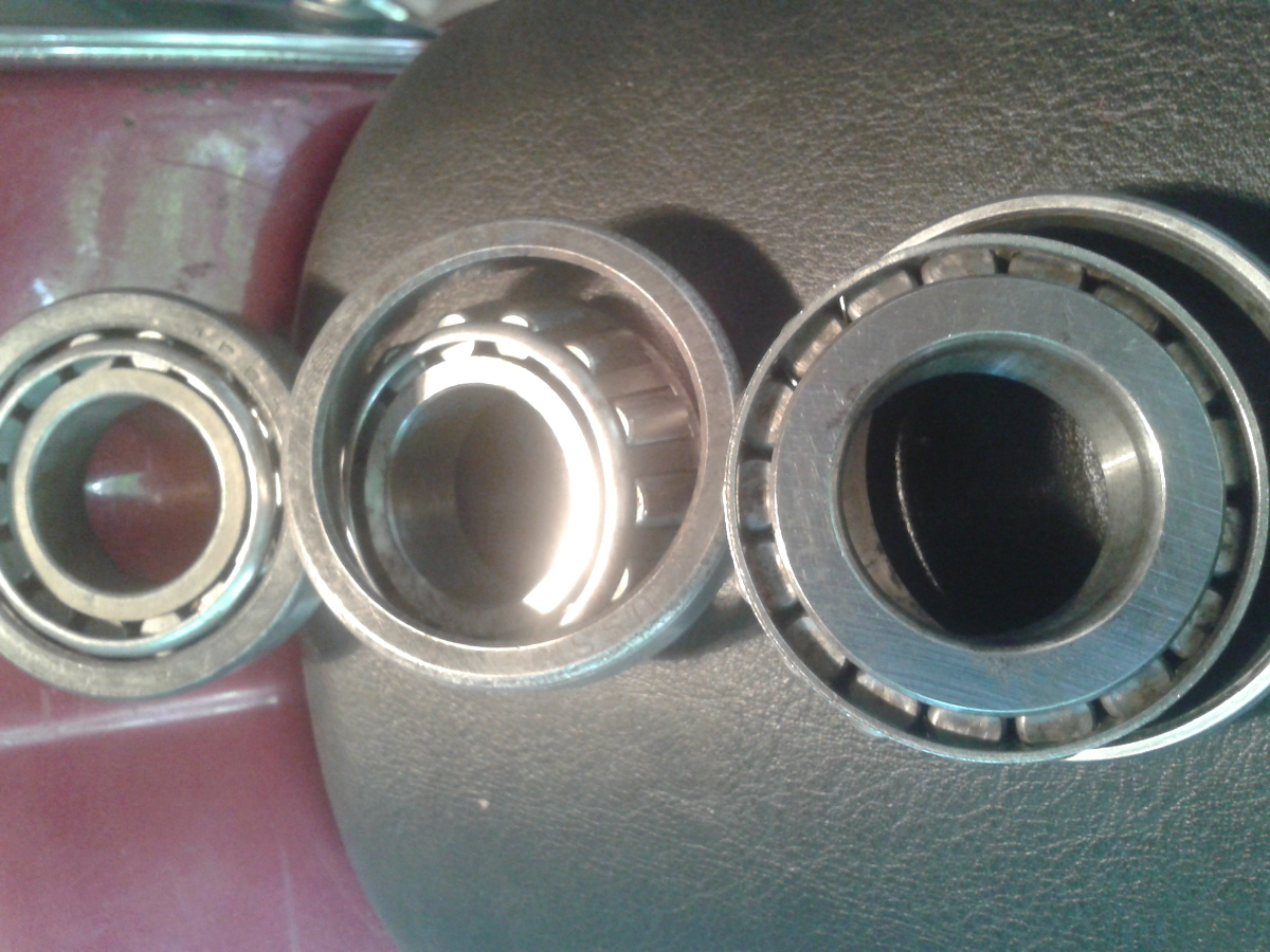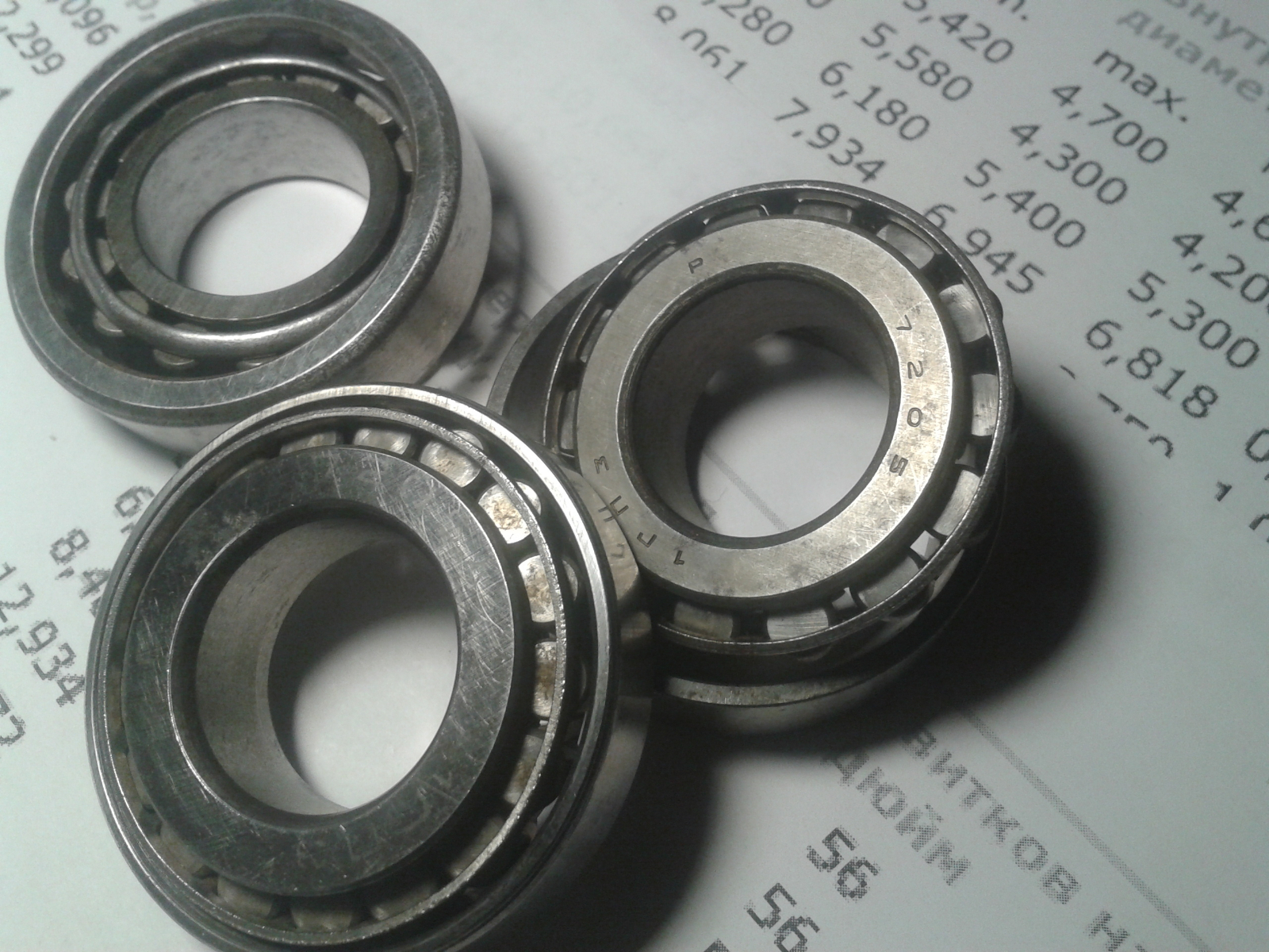 подшипники точно новые и точно совдеповские, (не китай,тайвань, польша или типа чехия) были в глубокой уже засохшей консервации. Отмыл, на поверхности в некоторых местах лишь видны лёгкие пятна окислений - не раковины от ржавчины!!!, а именно оксидное потемнение. То есть подшипники в отличном состоянии. На рабочих поверхностях - роликах и внутренней части конуса наружной обоймы и этих пятен нет.
